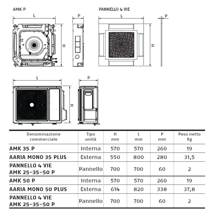 I condizionatori AARIA MONO PLUS-AMK, con installazione a cassette, nascono come proposta per ambienti di media e piccola dimensione, per consentire proposte con rendimenti energetici elevati aventi un design funzionale. AARIA MONO PLUS-AMK offre due taglie di potenze da 3,5 kW e 5,0 kW. Il ventilatore centrifugo dell’unità interna ha tre velocità che permettono di raggiungere elevati livelli di silenziosità alla velocità super minima. L’unità è ultra compatta con una profondità di 260 mm con un pannello di copertura di 700x700 mm.