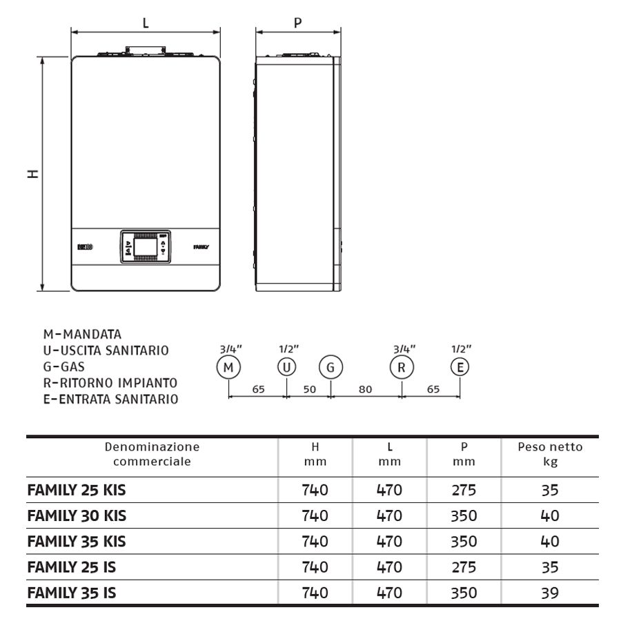 FAMILY è disponibile in 3 taglie 25, 30 e 35 kW, in versioni combinate (KIS) e solo riscaldamento (IS).