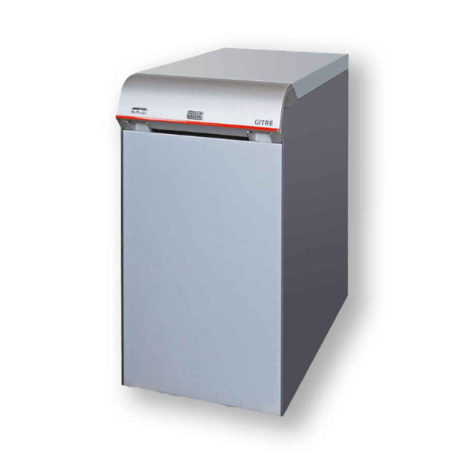 Caldaia a basamento in ghisa con tre torri di scarico e un bruciatore di gasolio monostadio, con combustione standard e basse emissioni inquinanti; camera di combustione orizzontale a umido e corpo caldaia altamente isolato. GITRÈ è disponibile in modelli per il solo riscaldamento o combinati con la produzione di acqua calda sanitaria, con serbatoi smaltati da 100 litri con doppio strato isolante.
