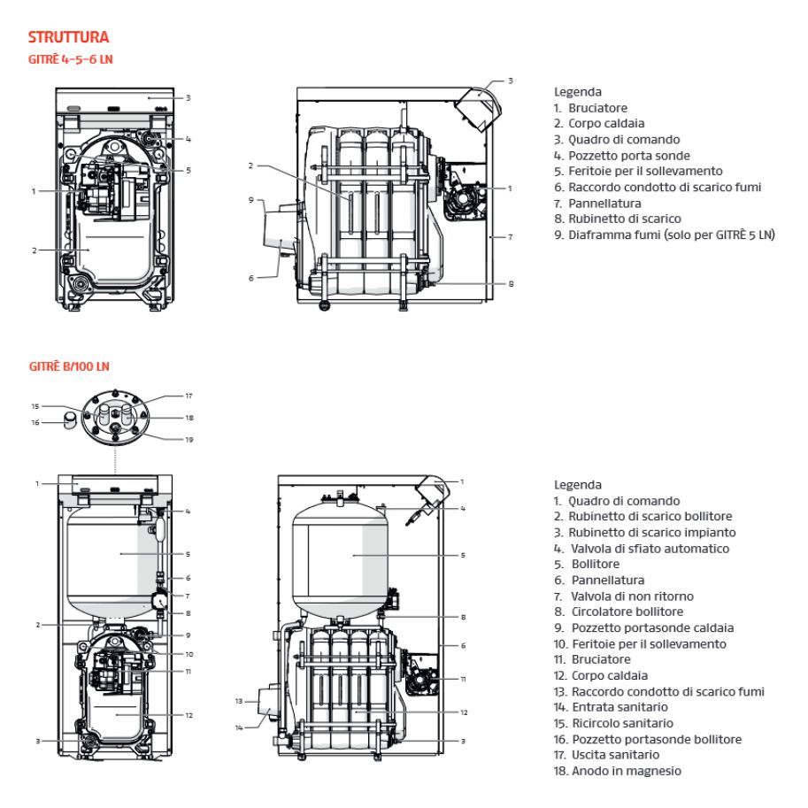 Caldaia a basamento in ghisa con tre torri di scarico e un bruciatore di gasolio monostadio, con combustione standard e basse emissioni inquinanti; camera di combustione orizzontale a umido e corpo caldaia altamente isolato. GITRÈ è disponibile in modelli per il solo riscaldamento o combinati con la produzione di acqua calda sanitaria, con serbatoi smaltati da 100 litri con doppio strato isolante.