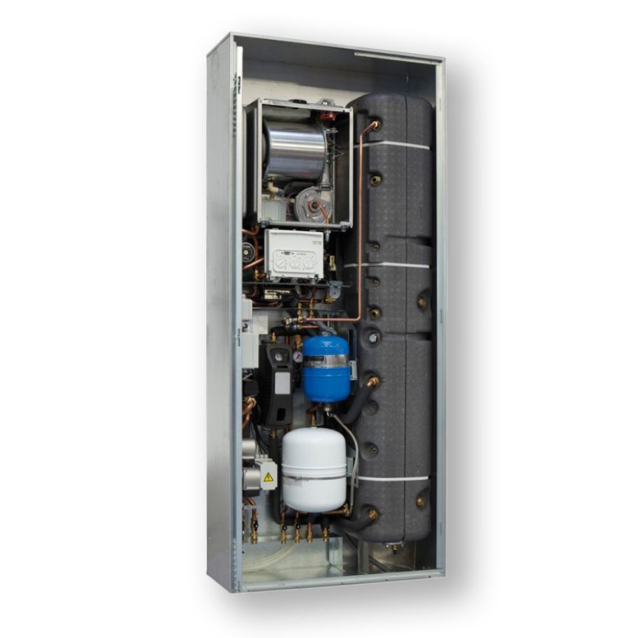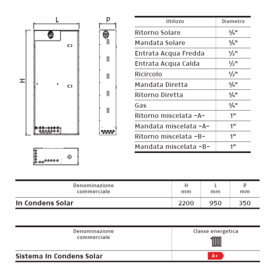 In Condens Solar è un gruppo termico premiscelato a condensazione per installazione in incasso per il riscaldamento e la produzione di acqua calda sanitaria ad integrazione solare. è disponibile con potenze da 20 a 32 kW nelle due versioni con caldaia combinata istantanea e bollitore mono serpentino e caldaia solo riscaldamento e bollitore bivalente a doppio serpentino.