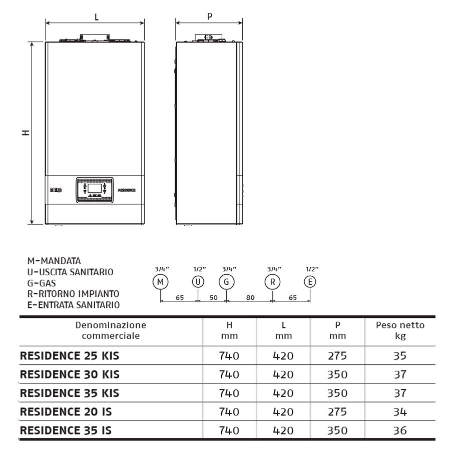 Residence è disponibile con potenze di 20, 25, 30 e 35 kW, in versioni combinate istantanee e solo riscaldamento.