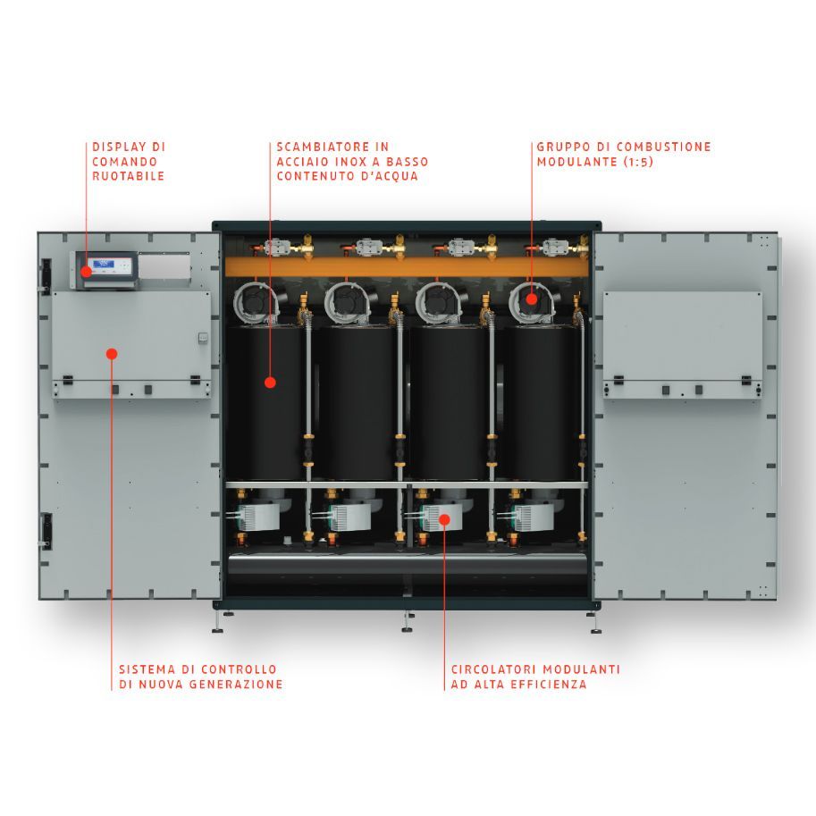 Gli armadi sono equipaggiati con 2, 3 o 4 elementi termici da 57 fino a 131 kW, per una potenza totale da 114 fino a 524 kW. Ad ogni modulo termico è associato un circolatore a basso consumo con regolazione modulante della portata acqua, in grado di mantenere costante il delta T° tra mandata e ritorno e massimizzare la condensazione e il rendimento. La fornitura di serie comprende inoltre la regolazione elettronica di gestione e controllo, collettori idraulici di mandata e ritorno, collettori gas, fumi e di scarico condensa.
